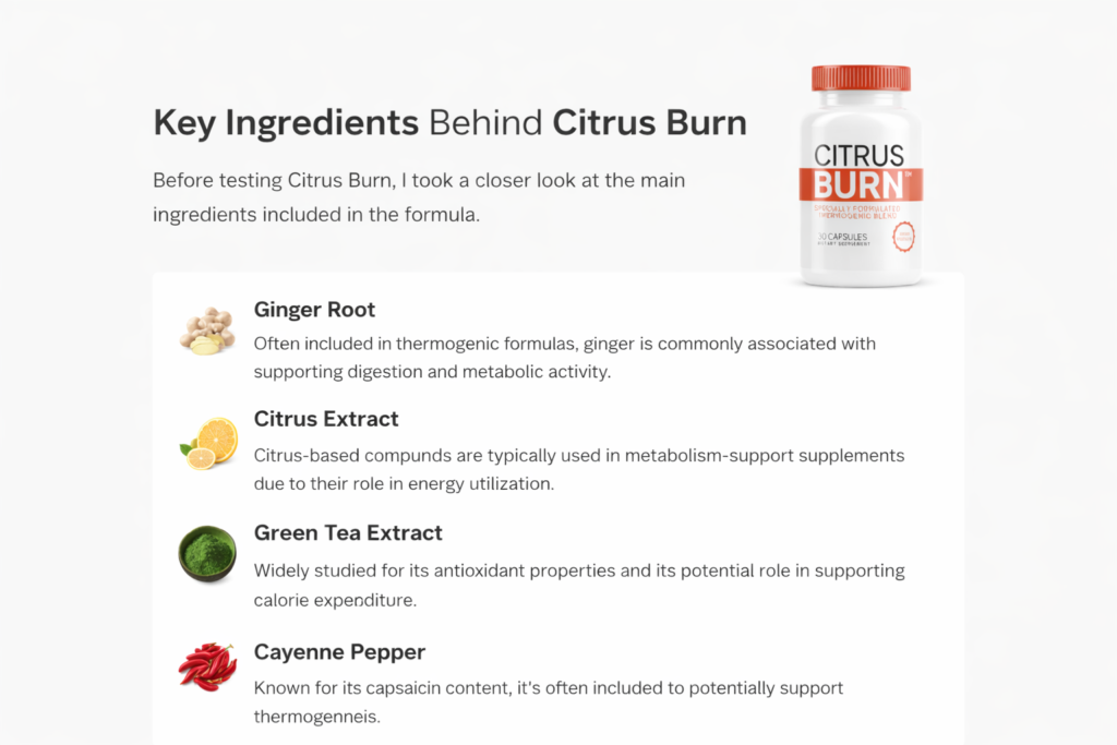Citrus Burn includes botanical ingredients commonly found in metabolism-focused supplements, such as citrus-derived compounds, green tea extract, ginger, and apple-derived ingredients.
